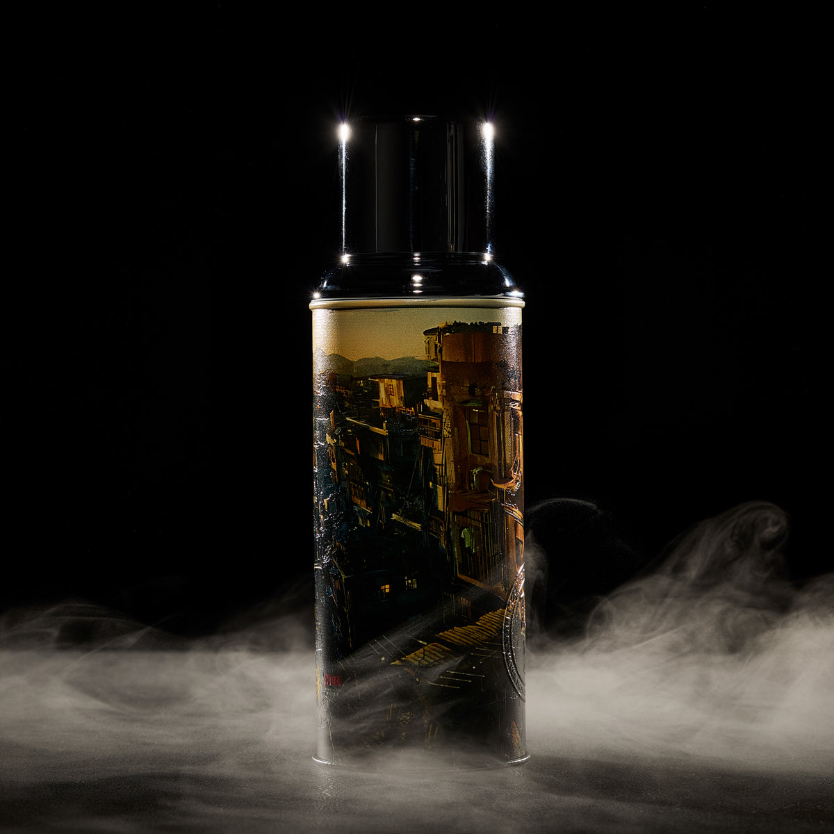 薄暮の光に沈むスカイラインと、ボトル全体に広がるディテールが、映画のスクリーンから切り取ったような一コマを思い出させます。