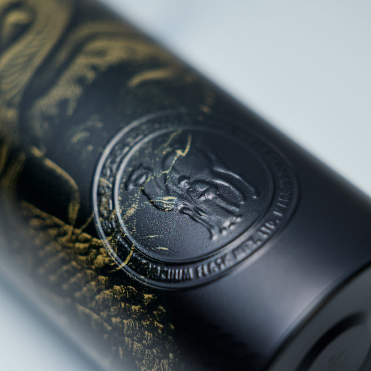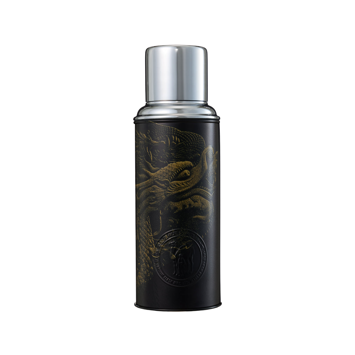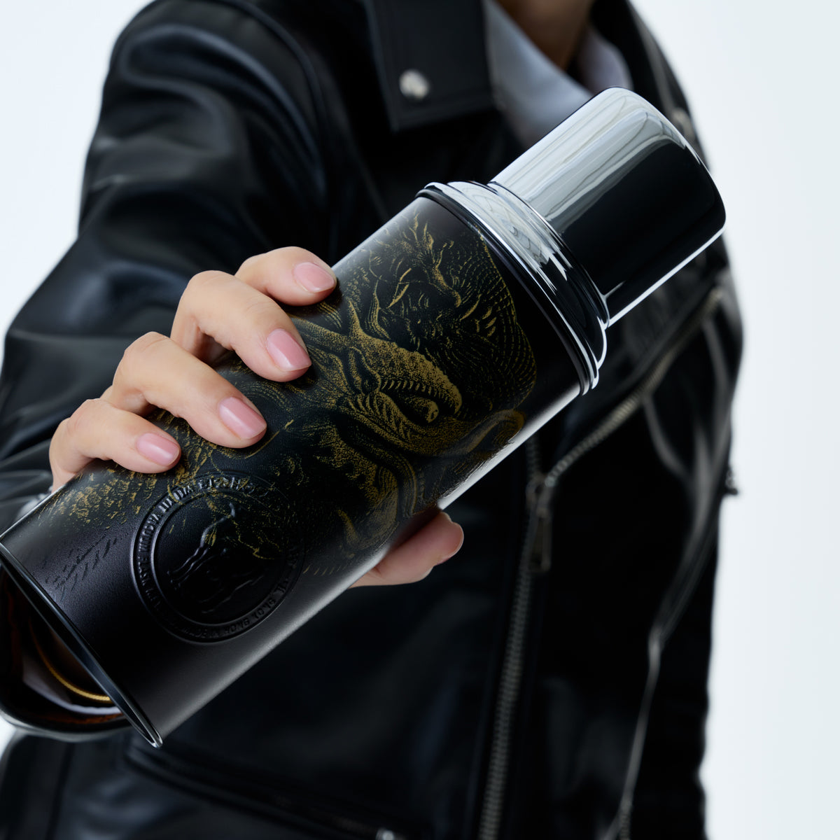 黒地に浮かび上がる金色のドラゴンと書のコントラストが印象的な一本。
