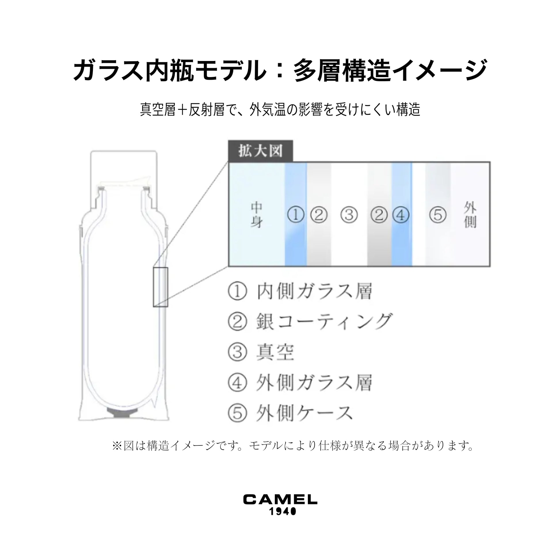 - 構造:ガラス内瓶・真空二重構造(魔法瓶構造)、金属外装(ホーロー塗装スチール/ステンレスなど)